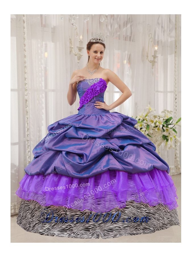 This quinceanera dress is abundant. The bodice features strapless neckline with rhinestone which adds luxury of the dress. The voluminous floor length skirt has been given depth with a pick up effect that creates soft, tiered ruffles down the gown. The zebra-stripe on the skirt make the dress more sexy.