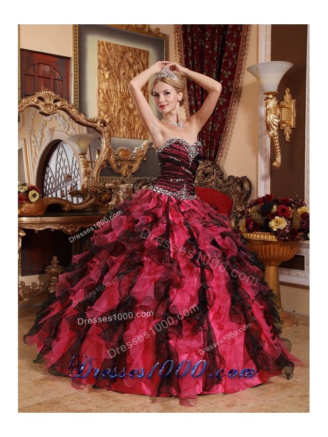 Glamous is the word created for this dress. The stunning quinceanera gown features a charming sweetheart neckline. the beaded corset bodice is covered with a layer of black organza which creates a sense of mystery. A princess cut with beading around the waist accents your figure. Layers of ruffles in contrasting color make the dress flirty.