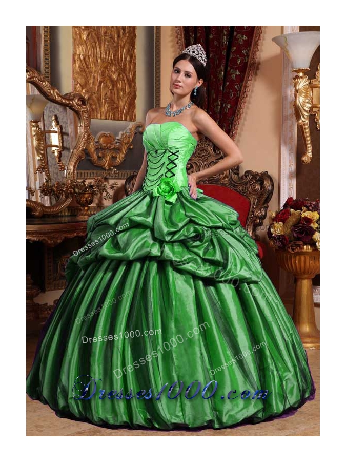 Romantic Green Puffy Strapless for 2014 Quinceanera Dress with Pick-ups and Flowers