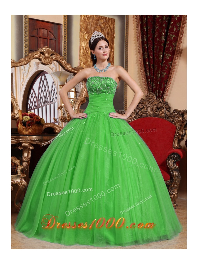 2014 Green Puffy Strapless Embroidery and Beading Quinceanera Dress