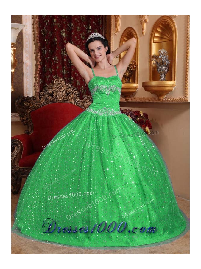 Classical Green Puffy Spaghetti Straps with Sequined Beading Quinceanera Dress for 2014
