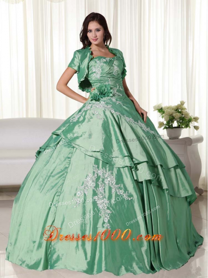 New Style Puffy Strapless Appliques for Green Quinceanera Dress for 2014