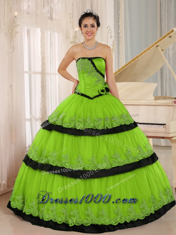 Wonderful work of handmade flowers and applique. You are the spotlight of the ball when you walk into the party in this dress. It features a strapless bodice with straight neckline in the delicate flowers and applique. It's a perfect design of Spring Green and black. The popular lace up back completes the look. This floor-length quinceanera dress will sure to dance the night away.