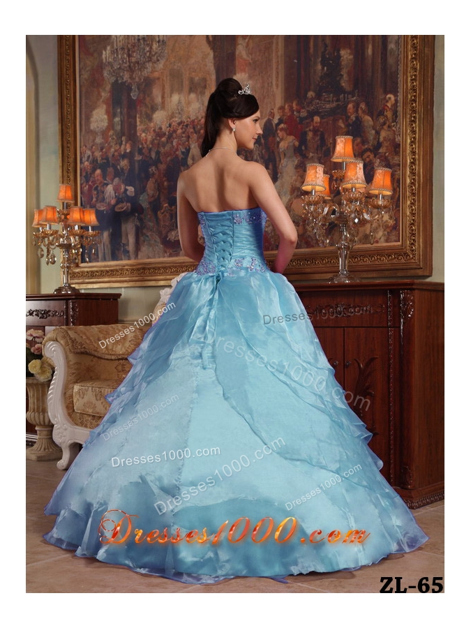 A stunning quinceanera dress for those occasions when you really want to 'wow' the crowd! Light ,dreamful and comfortable organza is always the favorites of the designers to make dresses. Strapless bodice adorned with beading around the bust area is eyecatching. Fitted ruching waist with a delicate handmade flower can outline your slim figure and charming curve. Layers of organza cascading down the sides make you feel you are fairy dancing in the flowering shrubs.