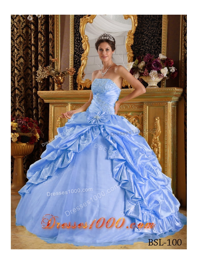 This amazing Baby Blue quinceanera dress will have you feeling – and looking – like royalty. It features a strapless bodice that's embellished with pretty beadings and embroidery on it, which depicts a flower in full bloom on the bodice.It also boasts pleats design,which is a signal of elegance. The skirt is long and flowing freely. Just a classical quinceanera dress for your event.