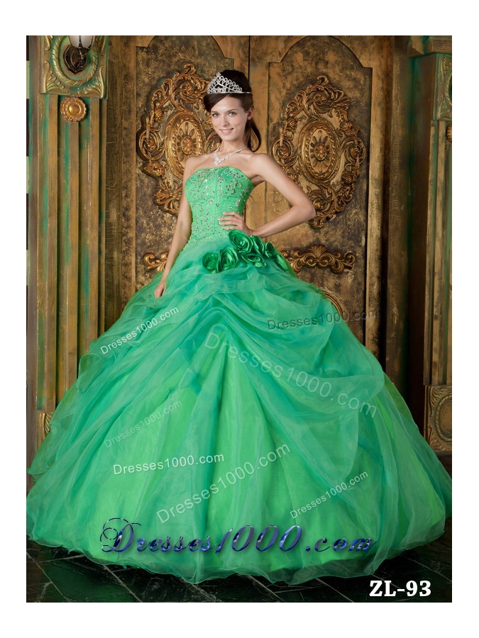 2014 New Style Green Puffy Strapless Beading Quinceanera Dress with Hand Made Flower