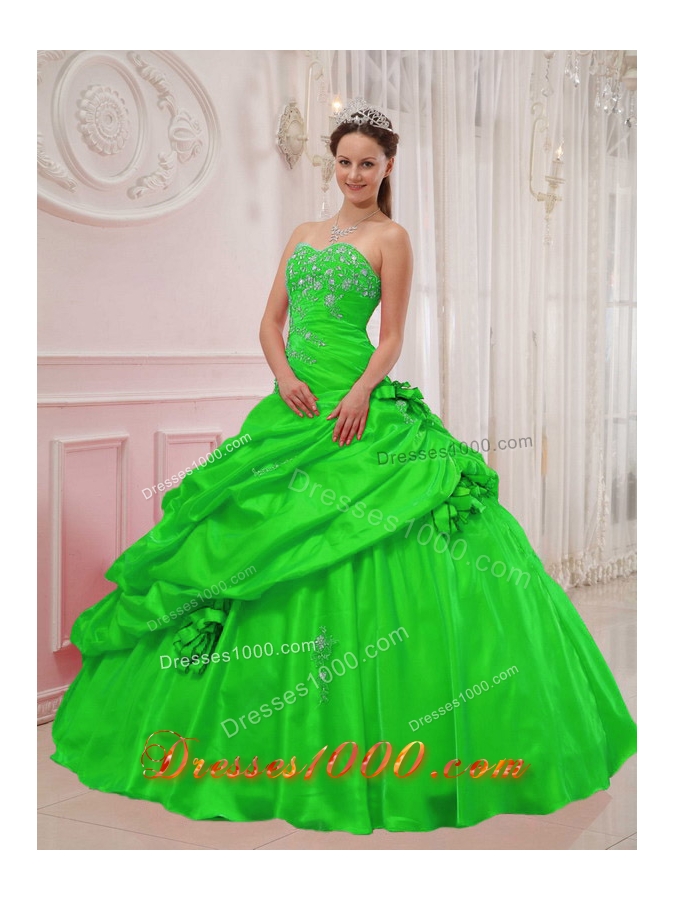 Gorgeous Puffy Sweetheart with Pick-ups and Appliques Decorate for 2014 Green Quinceanera Dress