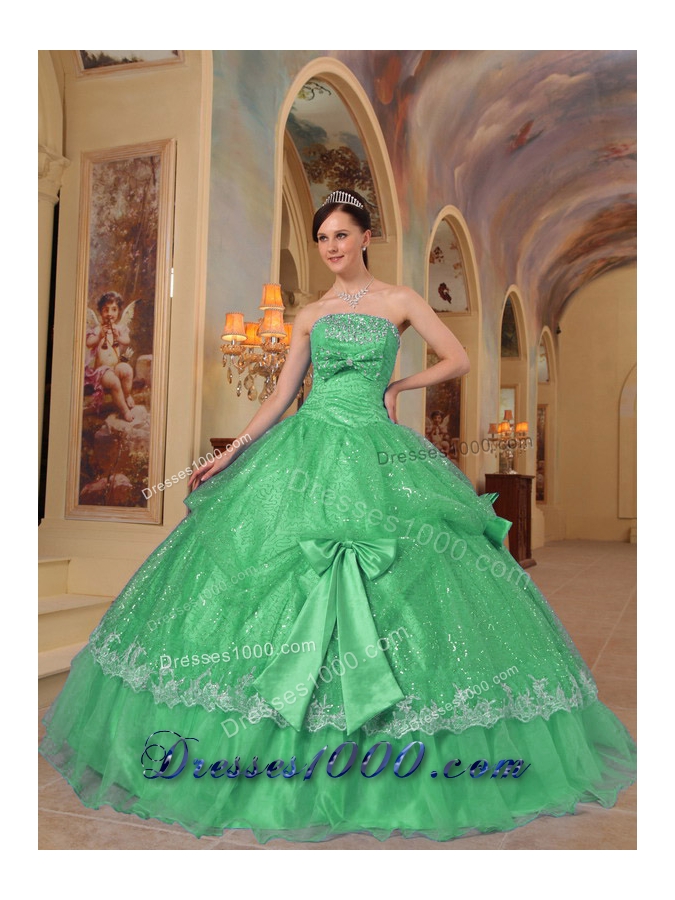 Lovely Puffy Strapless Bows Sequins for 2014 Green Quinceanera Dress
