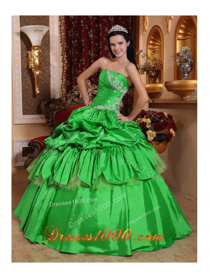Romantic Puffy Strapless with Pick-ups and Appliques for 2014 Green Quinceanera Dress
