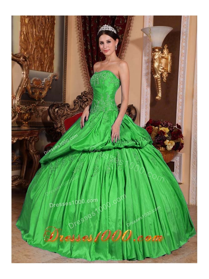 Inexpensive Spring Green Puffy Strapless Beading Decorate for 2014 Quinceanera Dress