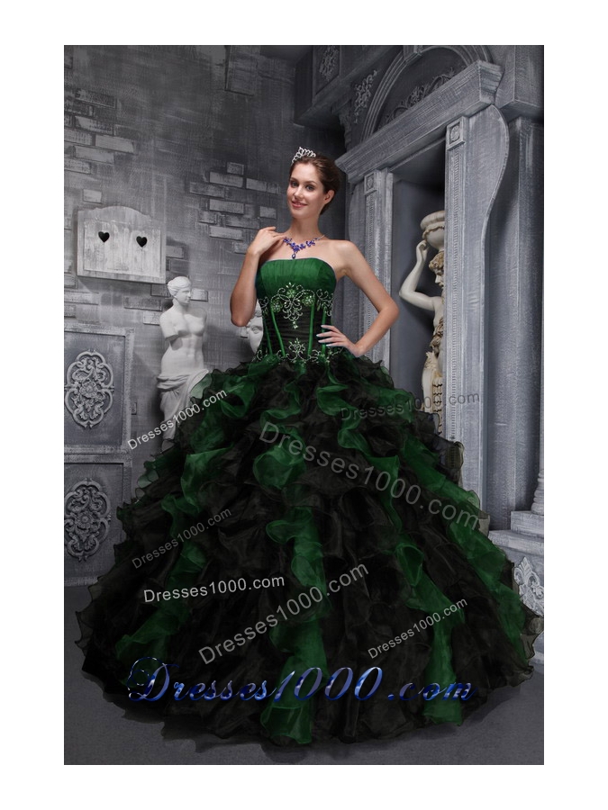Exclusive Strapless for 2014 Appliques and Ruffles for Green and Black Quinceanera Dress