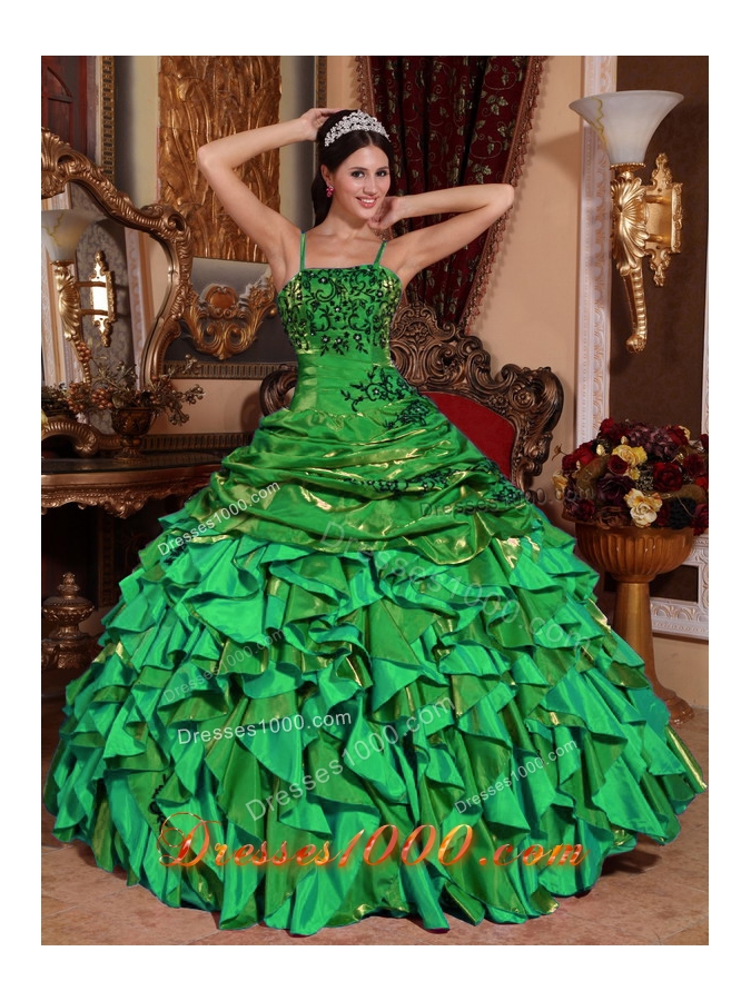 2014 Beautiful Green Puffy Straps Embroidery and Beading Quinceanera Dress