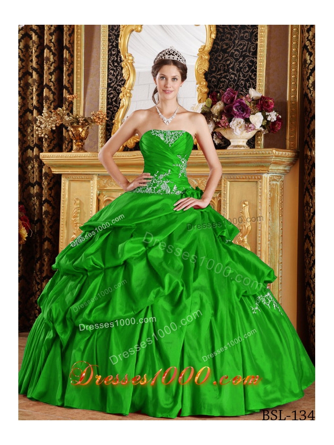 2014 Sweet Green Puffy Strapless Appliques Quinceanera Dress with Pick-ups