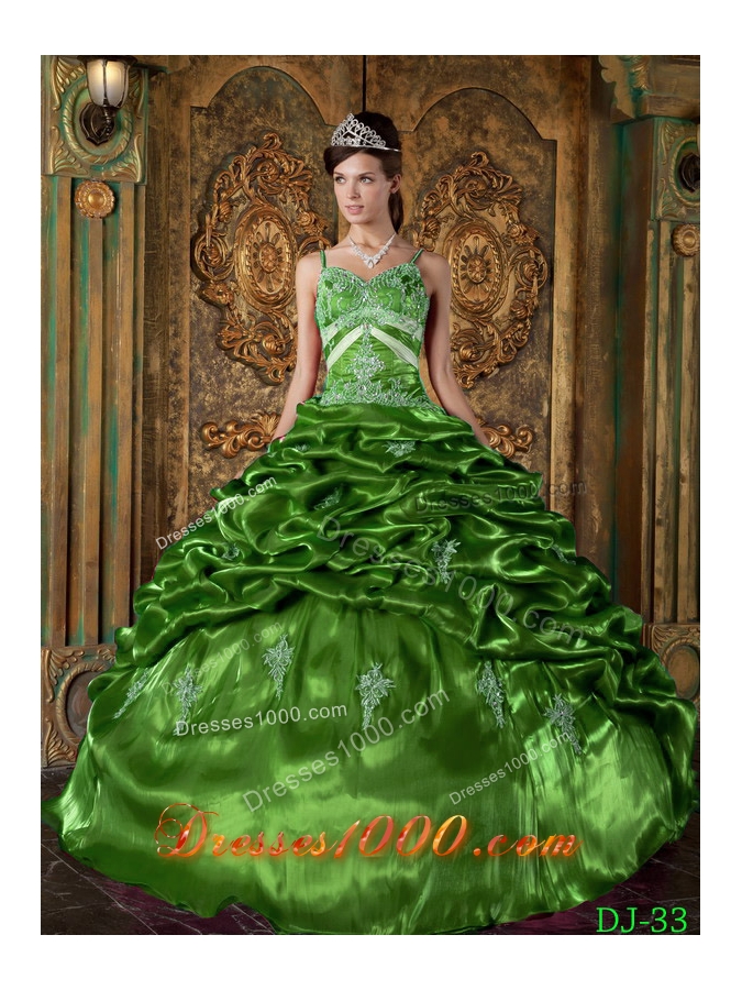 2014 Beautiful Puffy Strap with Appliques and Beading Decorate for Green Quinceanera Dress