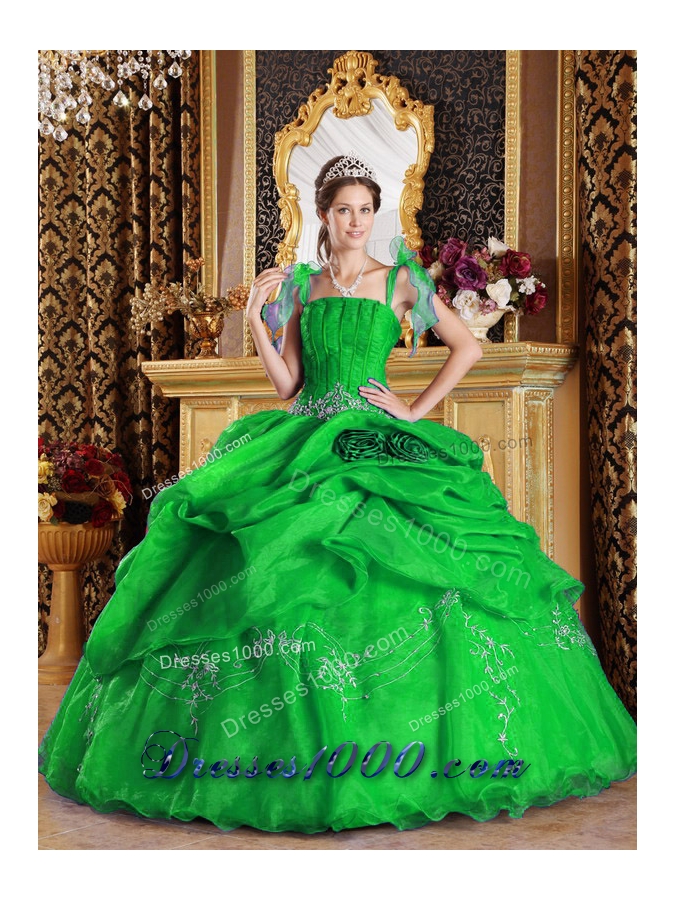 Puffy Spaghetti Straps with Hand Made Flowers and Pick-ups Decorate for 2014 Green Quinceanera Dress