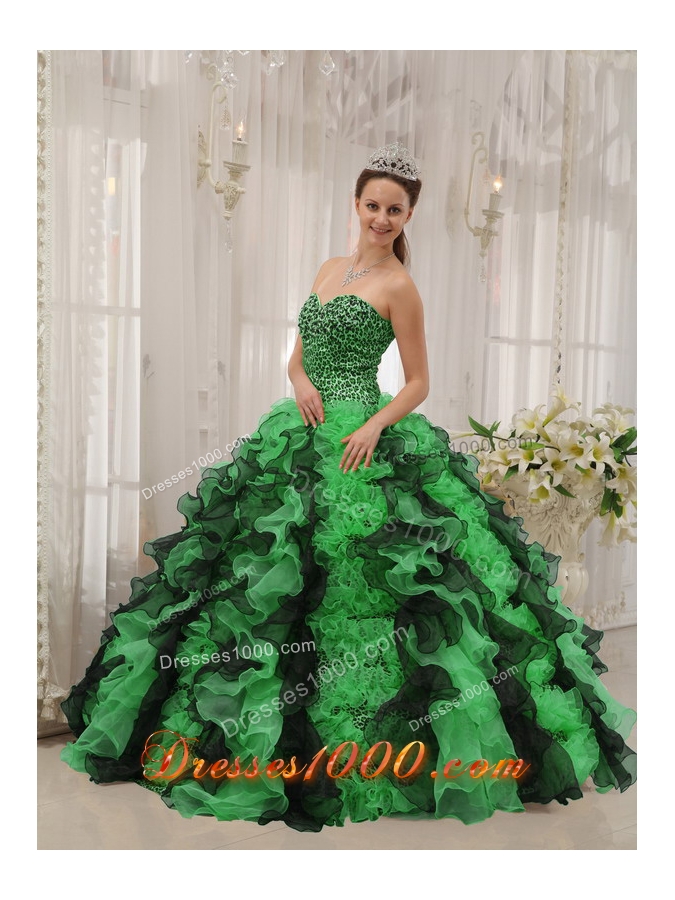 Cute Puffy Sweetheart with Ruffles and Beading for 2014 Green and Black Quinceanera Dress