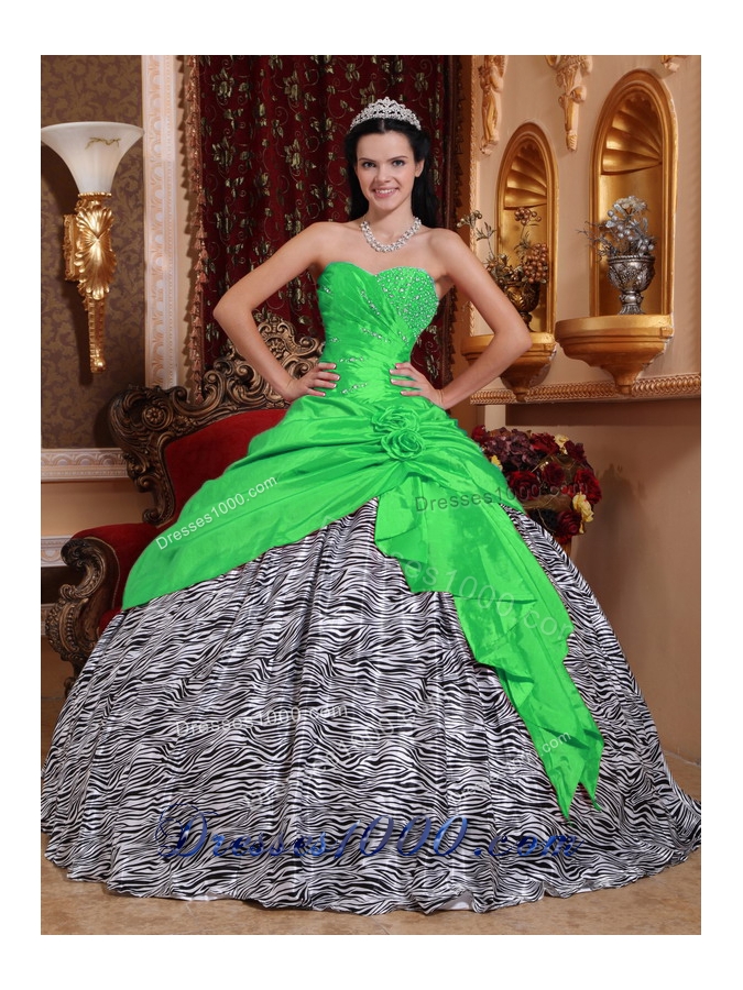 Stunning and dramatic! This hot pink, strapless quinceanera dress will make you become the spotlight in any occasion.The bocdice is accented with a sweetheart neckline and lovely beadwork.The flower decoration in the middle section is so chic that make the dress fabulous,while the zebra print skirt is simple yet gorgeous to give you sense of delicate beauty.A lace up back completes this wonderful design.