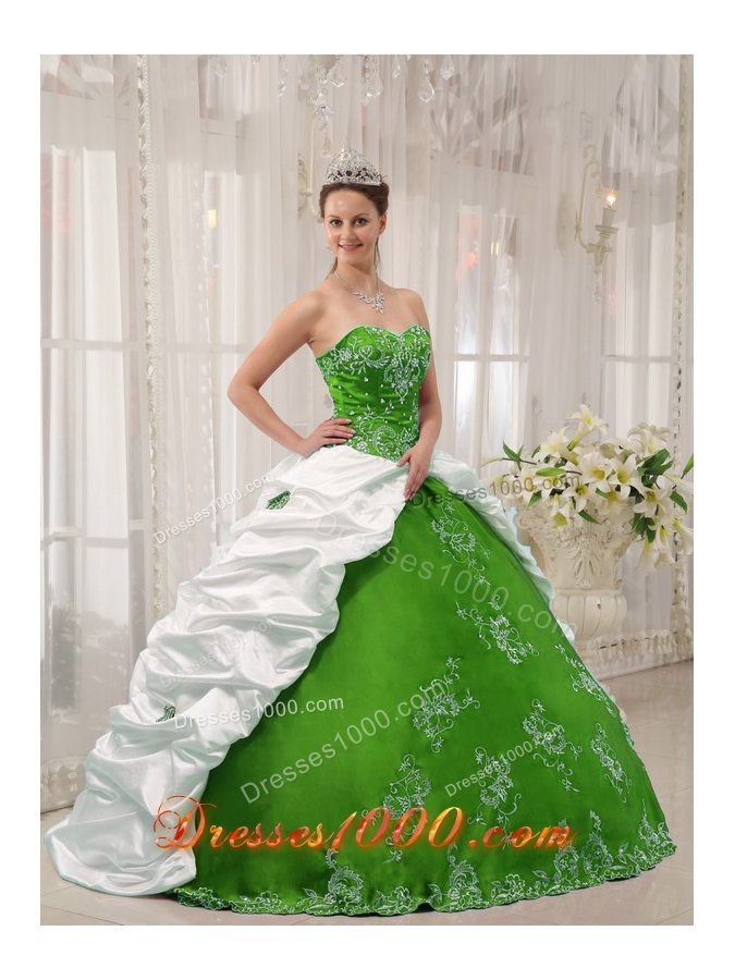 2014 Puffy Sweetheart Embroidery for White and Green Quinceanera Dress with Pick-ups