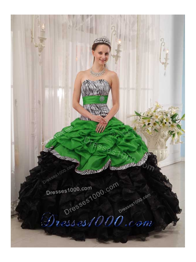 This quinceanera dress is particular. The strapless sweetheart neckline shows off your shoulders and draws attention to your beautiful face.A thick criss, pleated waistband cinches in the waistline to reveal your phenomenal curves. A ruffled overskirt drapes beautifully over the flaGreen, floor-length skirt, which has alternating solid and animal-print bands.You will make a grand entrance and a lasting impression by slipping into this exquisite ball gown.