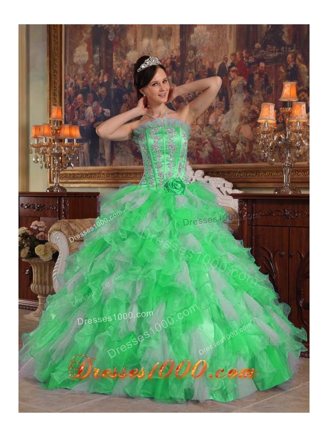 Puffy Strapless with Flowers and Appliques Decorate for 2014 Green Quinceanera Dress