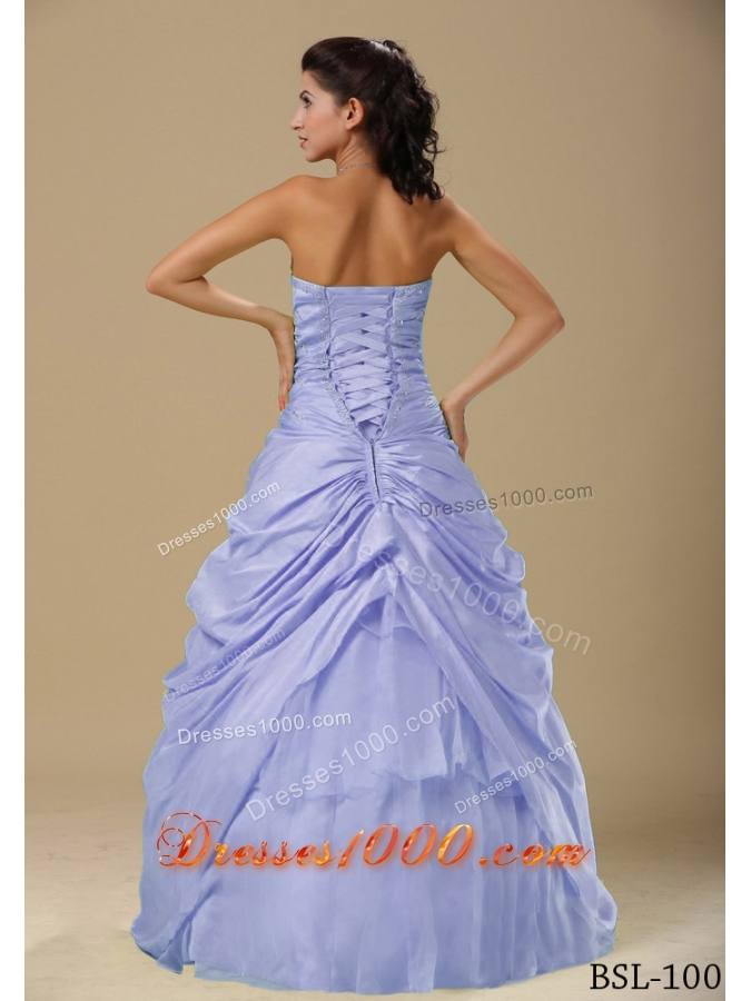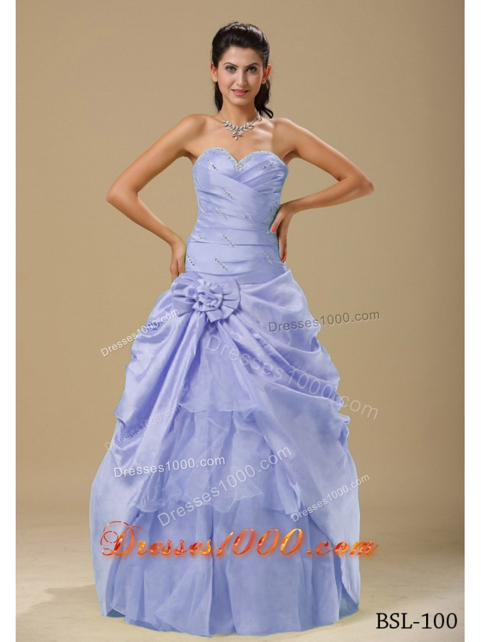 Make yourself the centerpiece of your party when you wear this ravishing ball gown dress. The strapless top features a sweetheart neckline, and pleated bodice embellished with delicate beading. The top layer of the impressive ball gown skirt is gathered, and a bouquet of matching flower accents the side.A lace up corset style closure in the back secures the dress in place.A lovely dress for any occasion!