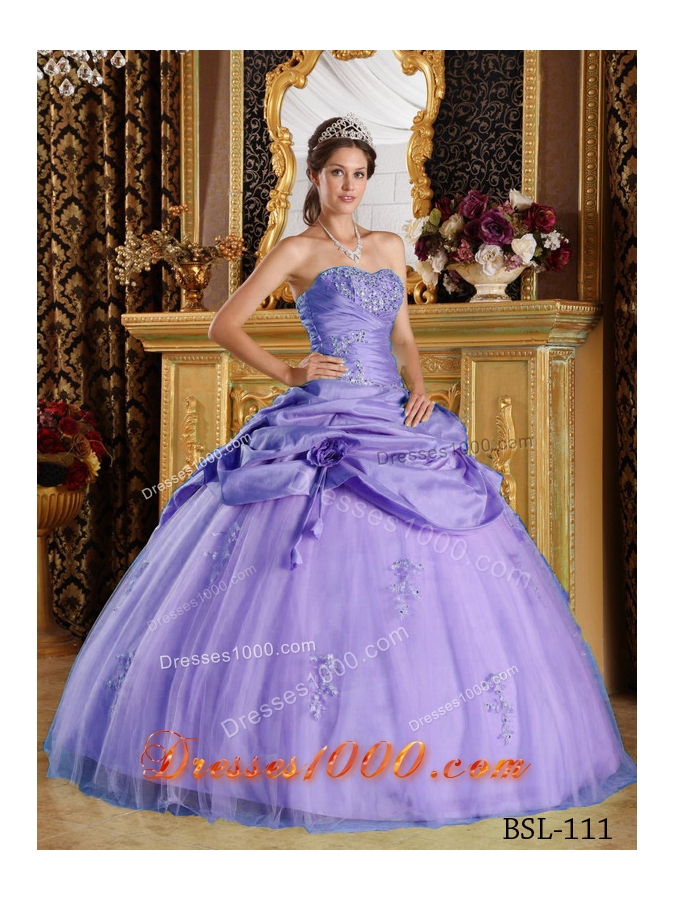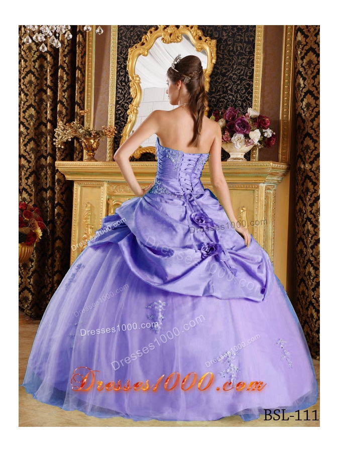 Lavender Puffy Strapless Beading Quinceanera Dresses with Hand Made Flower