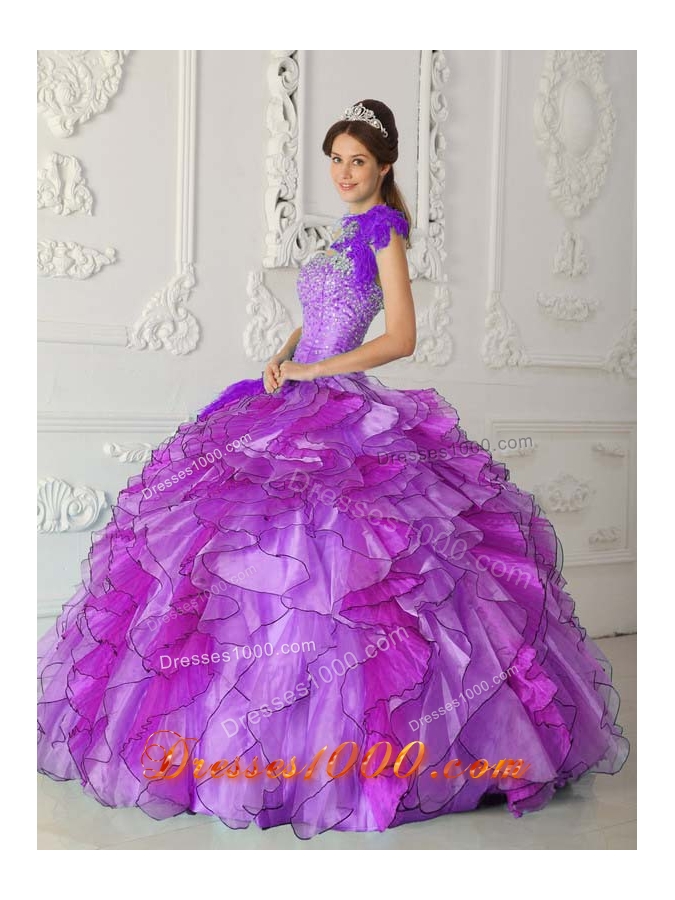Opulence is the word written all over this dress. It is truly an example of high end couture fashion. The quinceanera dress features a one shoulder top with a feather strap and full beaded bodice. The floor-length skirt is a long and winding series of ruffles that begins at the hips and envelopes the legs in luxurious tulle all the way to the floor in a pretty shape. If you're looking for a high-end dress without the high-end price tag, this is definitely one you should consider.