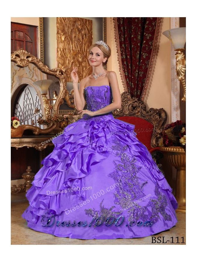 Strapless dresses are one of the sexier styles on the market today. They show just enough skin to be classy without being too revealing. This one features a lovely brocade style appliques across the whole dress. The amazing ball gown skirt is reminiscent of the old fashioned hoop skirts and is made from several layers of pieced fabric that add another dimension of beauty to an already lovely gown. The dress sways beautifully across the floor when you move, as if you're floating on air. A lace up corset style closure in the back secures the dress in place.