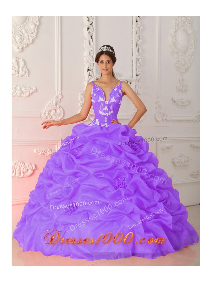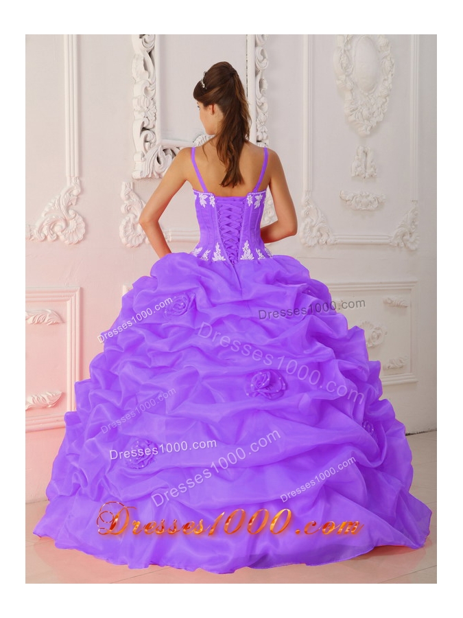 This special designed two straps quinceanera dress features delicate appliques on the bodice. The puffy skirt is created by fashionable pick ups. Beautiful hand-made flowers scattered on the whole skirt to make the dress gorgeous. Owning it, realize your sweet dream.