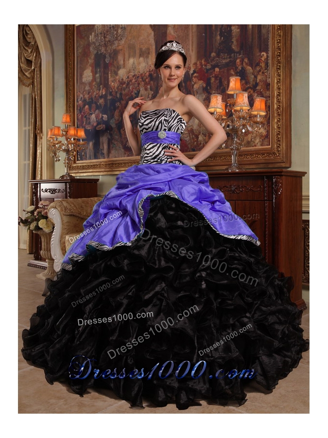 Youll feel like a princess when you are wearing this stunning quinceanera dress! It has a strapless bodice with mature zebra print throughout.Beneath the bustline of the dress is embellished with a ruched band together with a shining rhinestone that makes the bosom stand out!The skirt of the gown is really a throwback from an earlier time and contains two tone amazing pick ups and ruffles.Tumbles of pick ups and ruffles all over the skirt cascade down the floor-length skirt to achieve pure perfection. A fabulous lace up completes the look.