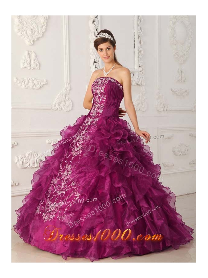 Fuchsia Strapless Organza Quinceanera Dress with White Embroidery
