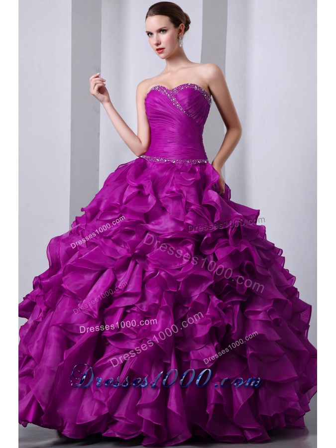 Sweetheart Organza Fuchsia Quinceanea Dress with Beading and Rufffles