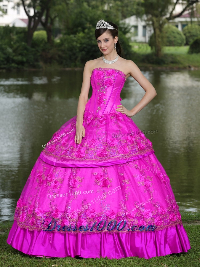 The strapless beaded floor length taffeta quinceanera dress is your perfect choice to attend ball, wedding and party.Fitting bodice design with beaded decoration and embellished appliques makes the gown so beautiful and sexy that you can gain more attention and no matter what you attend,you will become the spotlight.Besides, the chic flowers both in the front and back section makes the bouffant skirt to creat a beautiful shape.A lace up back completes this exquisites dress.
