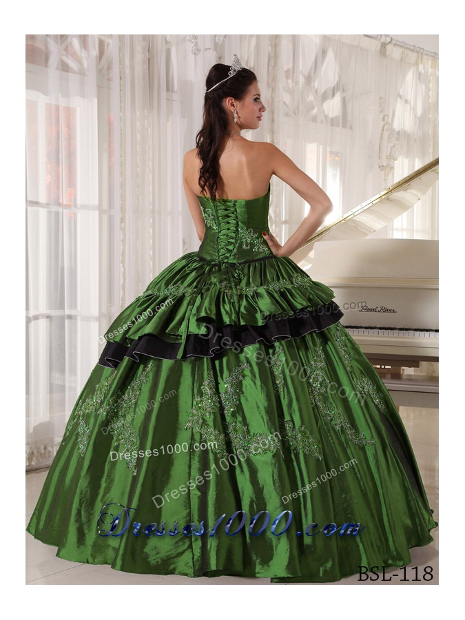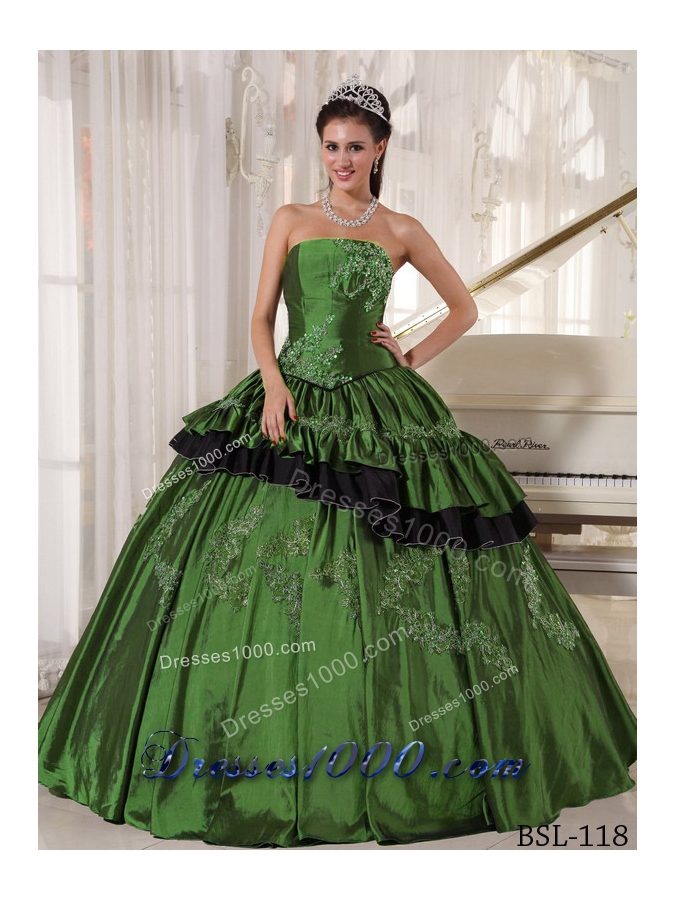 This beautiful straight neckline olive green quinceanera dress is featured with the small skirt covering the bottome of the dress. And the black tulle under the olive dress forms contrasting colors , which impinges your eyes easily. And the silver appliques with beading decorate the dress perfectly.