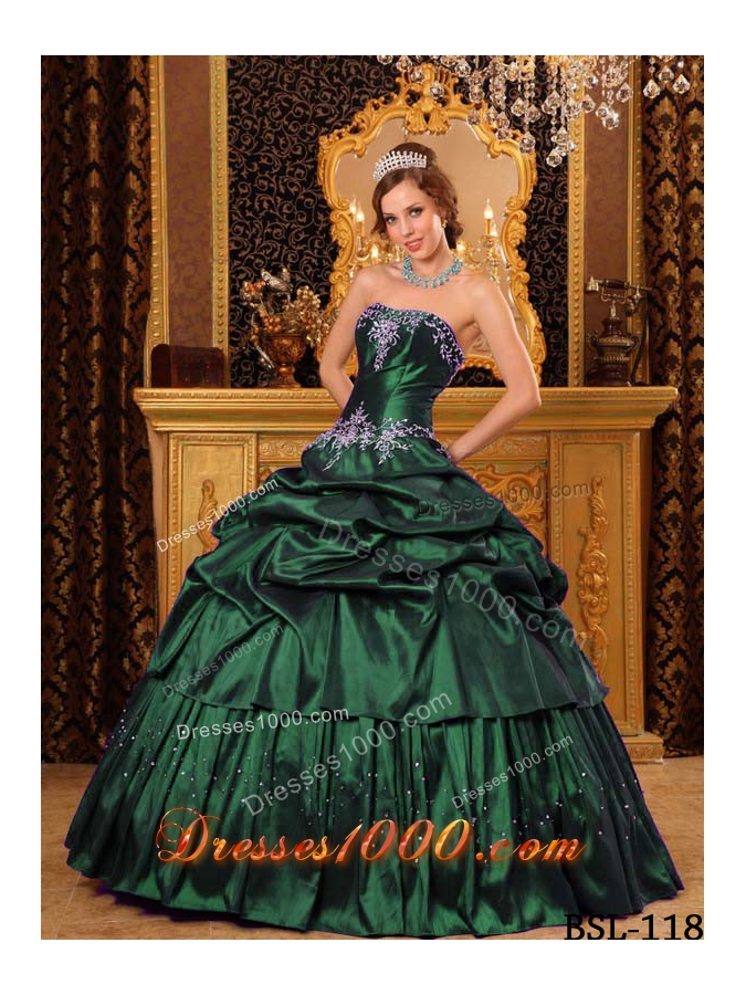 Cheap Ball Gown Strapless Dark Green Quinceanera Dresses with Appliques