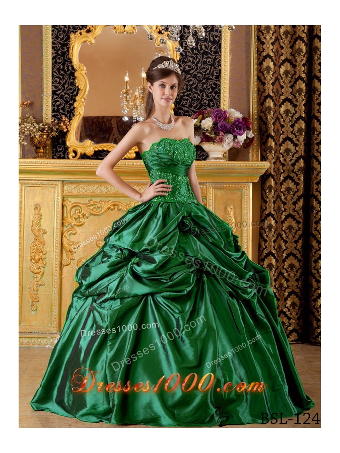 A graceful sexy strapless neckline quinceanera gown features with a ruched under bustline and a pick-uped gown. Appliques defines the bodice and the gown through out. The dress catches it on gown asymmetrically to form the pleated shape and shows off your charming movement.The flowers and appliques are finely decorate the cathed points.A lace up corset style closure in the back secures the dress in place.Throughout the full green dress, the elegant and poised temperature is displayed entirely.