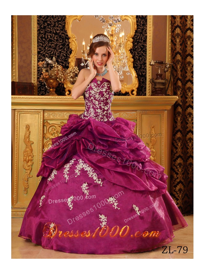 Strapless Organza Pick-ups Quinceanera Dress with White Appliques