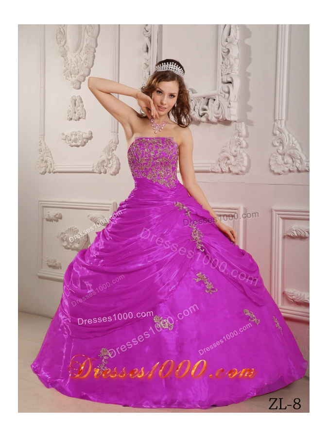 Strapless Fuchsia Organza Appliques Decorate Quinceanera Dress