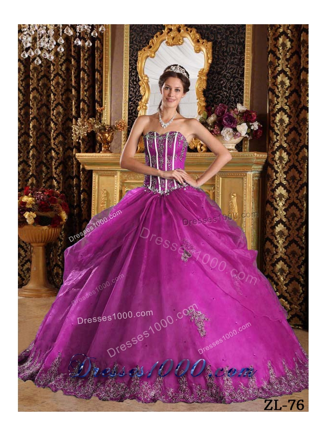 Sweetheart Fuchsia Organza Appliques Decorate Dresses For a Quinceanera