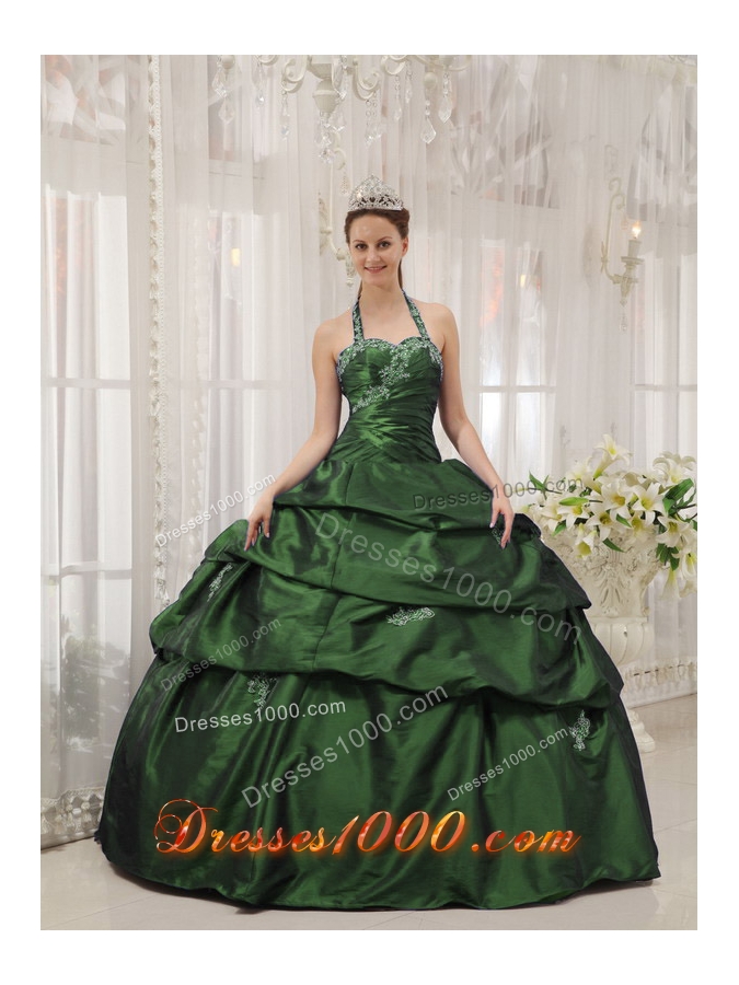 2014 Spring Dark Green Ball Gown Halter Quinceanera Dresses with Appliques
