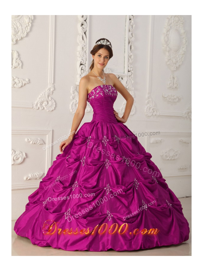 Fuchsia Strapless Taffeta Appliques and Pick-ups Quinceanera Gowns