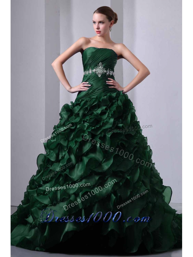 Princess Strapless Brush Train Quinceanea Dress with Beading and Ruffles
