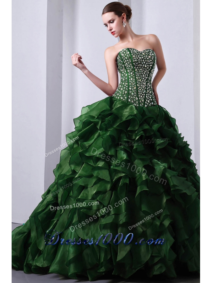 Green Princess Sweetheart Brush Train Organza Quinceanea Dress with Beading and Ruffles