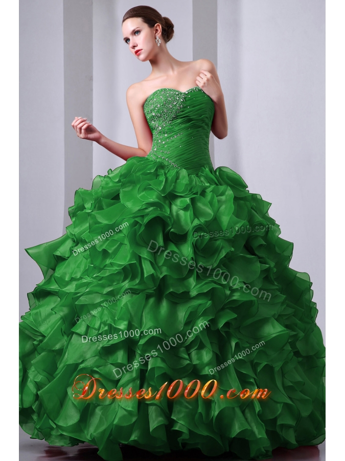 Green Princess Sweetheart Organza Quinceanea Dress with Beading and Ruffles