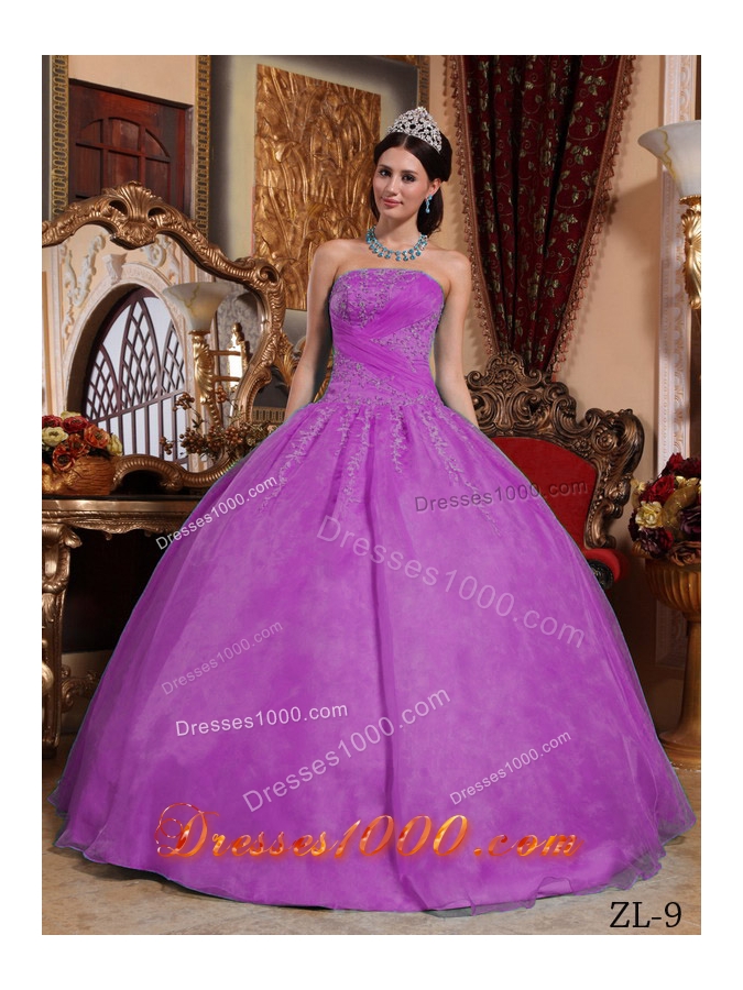 Strapless Fuchsia Organza Quinceanera Dress with Lace Appliques