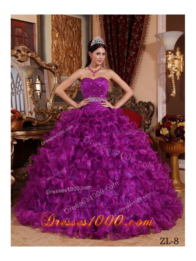 Fuchsia Sweetheart Organza Beaded Decorate Waist Quinceanera Dress