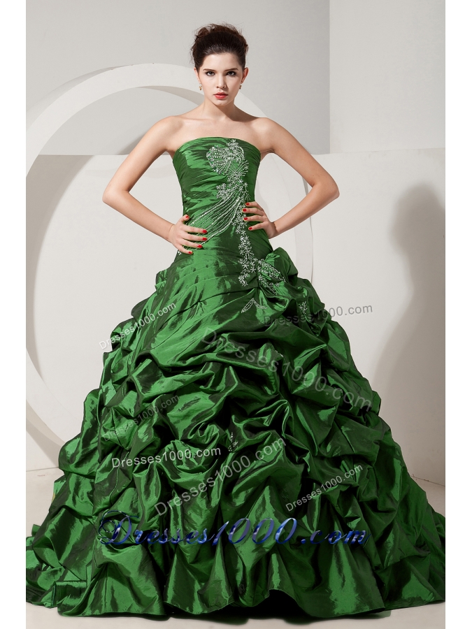 Green Princess Strapless Brush Tain Quinceanera Dresses with Taffeta Beading