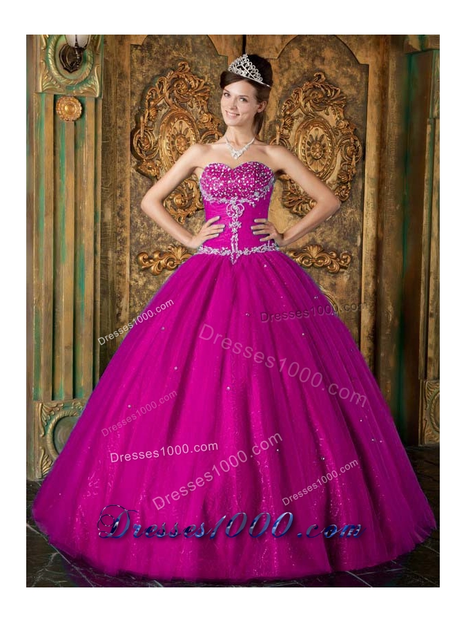Sweetheart Fuchsia Beading and Appliques Tulle Sweet 15 Dresses