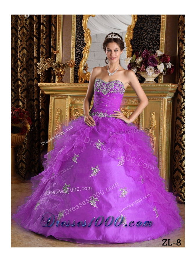 Sweetheart Organza Quinceanera Dress with White Appliques and Ruffles