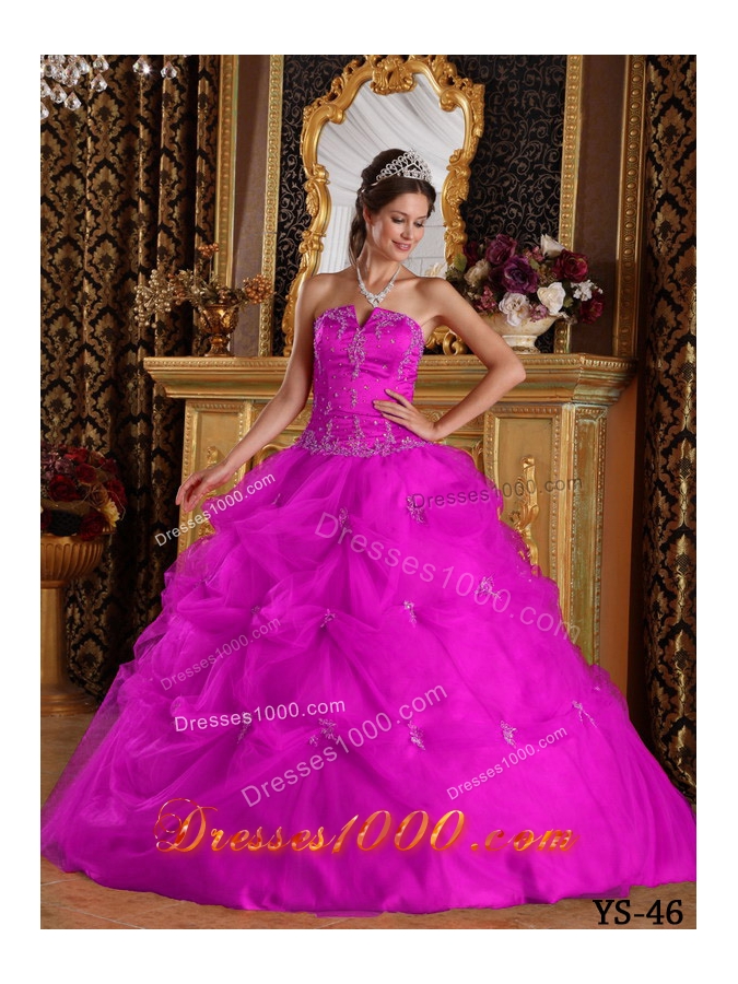 Appliques and Pick-ups Strapless Fuchsia Tulle Quinceanera Dress